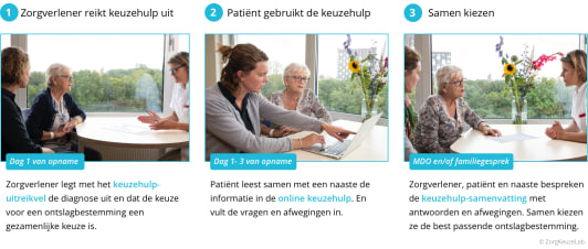 Annerije: We scoren hoog op het uitreiken van de keuzehulp, de verpleegkundigen en secretaresses zitten daar goed bovenop. Maar het uitreikvel blijft daarna wel eens op het nachtkastje van de patiënt liggen. Deels speelt de houding van de patiënt hierin een rol, de ene patiënt heeft er meer behoefte aan dan een ander om mee te denken. Maar wat wel erg helpt is het benoemen van de keuzehulp bij opname. Dat het proces voor de patiënt duidelijk is. We willen met u in gesprek: wie bent u, wie was u voor deze opname en vooral ook, waar gaan we met z'n allen naartoe? Door direct de voorlichting te geven over de volgende stap, neem je de patiënt en familie al vanaf het begin mee in het proces.