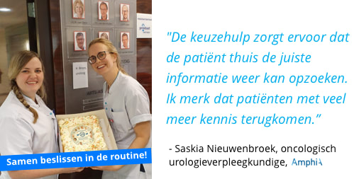 Het gebruik van de keuzehulp kost ons effectief geen extra tijd. Het is juist fijn dat een patiënt thuis toegang heeft tot de keuzehulp. We merken dat het onze patiënten goede en duidelijke ondersteuning biedt om samen te kunnen besluiten over de behandeling.