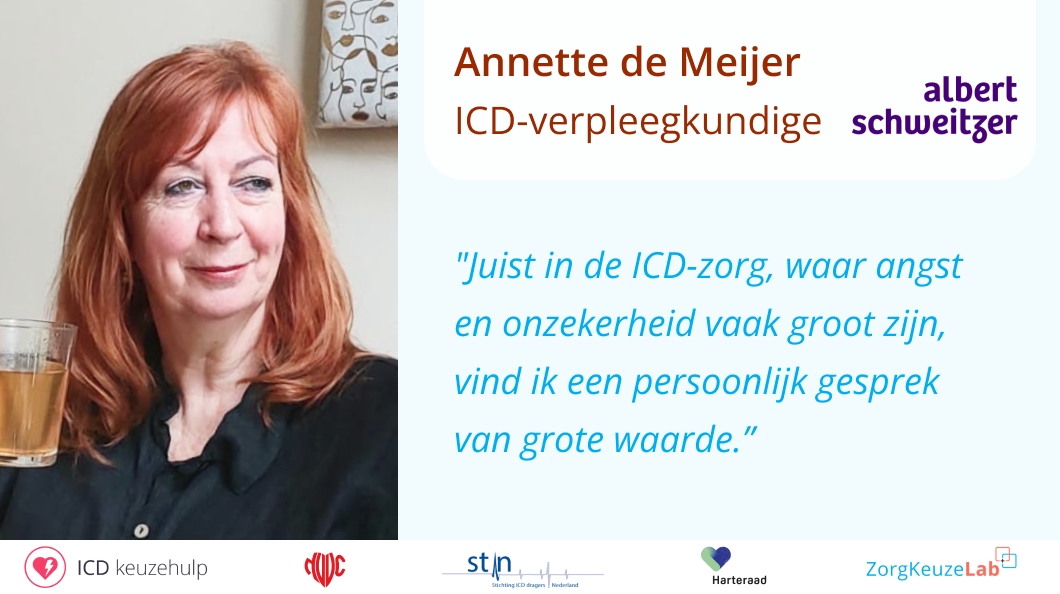Het belangrijkste dat Annette aan patiënten wil meegeven is dat een ICD, of een wissel voor een ICD, geen verplichting is. “U mag ook nee zeggen. U beslist over uw eigen lichaam.” Zeker bij oudere patiënten, die vaak geneigd zijn om te doen doen wat de arts zegt. “Ik bespreek de voor- en nadelen, benoem mogelijke complicaties en check bij patiënten of ze het begrijpen. Ik help mensen de keuze zélf te maken. Niet uit angst, maar uit bewustzijn.”