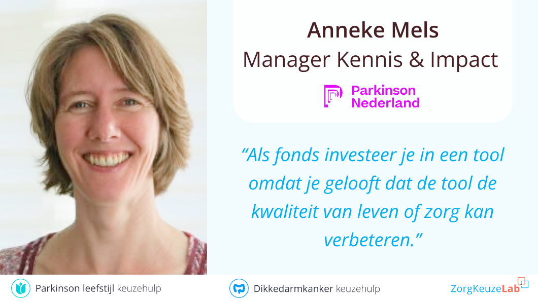 Als manager Kennis & Impact bij ParkinsonNederland is Anneke Mels betrokken bij de ontwikkeling en implementatie van de Parkinson leefstijl keuzehulp. Eerder werkte ze mee aan de ontwikkeling van de keuzehulp voor uitgezaaide dikkedarmkanker vanuit MDL Fonds.