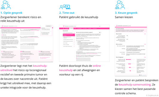 Ook onderzoeken we in hoeverre de keuzehulpen helpend waren in het personaliseren van zorg. Daarom interviewen we nu zorgverleners en patiënten over hoe ze de keuzehulpen hebben gebruikt, hoe tevreden ze zijn en wat ze anders wensen te zien. Zo kunnen we de keuzehulpen verder verbeteren.