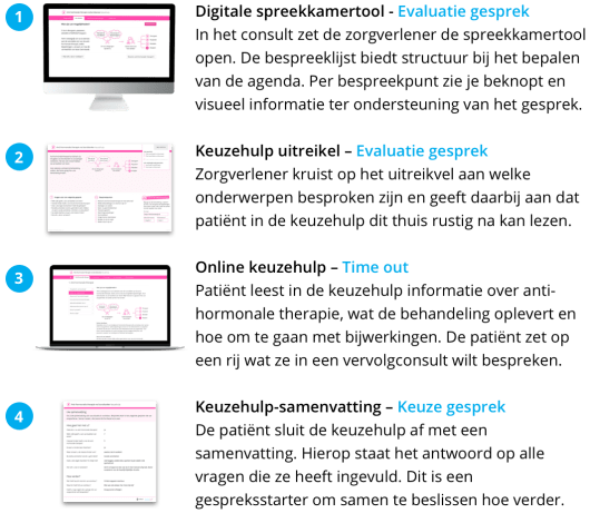 Ook biedt de keuzehulp de patiënt tijd om na te denken over wat zíj wilt, wat voor haar belangrijk is. Het maakt patiënten bewust dat er meer mogelijk is dan stoppen of doorgaan met de anti hormonale behandeling. Patiënten kunnen samen met hun naasten de keuzehulp thuis bekijken en hoeven niet onder druk in de spreekkamer een beslissing te nemen. Ze hebben tijd om te wikken en wegen en kunnen bij klachten de adviezen toepassen, die worden gegeven bij bijwerkingen. Bij de vervolgafspraak op de polikliniek bieden de tools structuur in het gesprek.
