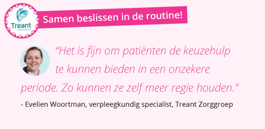 Het is fijn om patiënten de keuzehulp te kunnen bieden in een onzekere periode. We merken dat de keuzehulp vooral geschikt is voor mensen die veel behoefte hebben aan informatie. Zo kunnen ze zelf meer regie houden, ook in het gesprek.