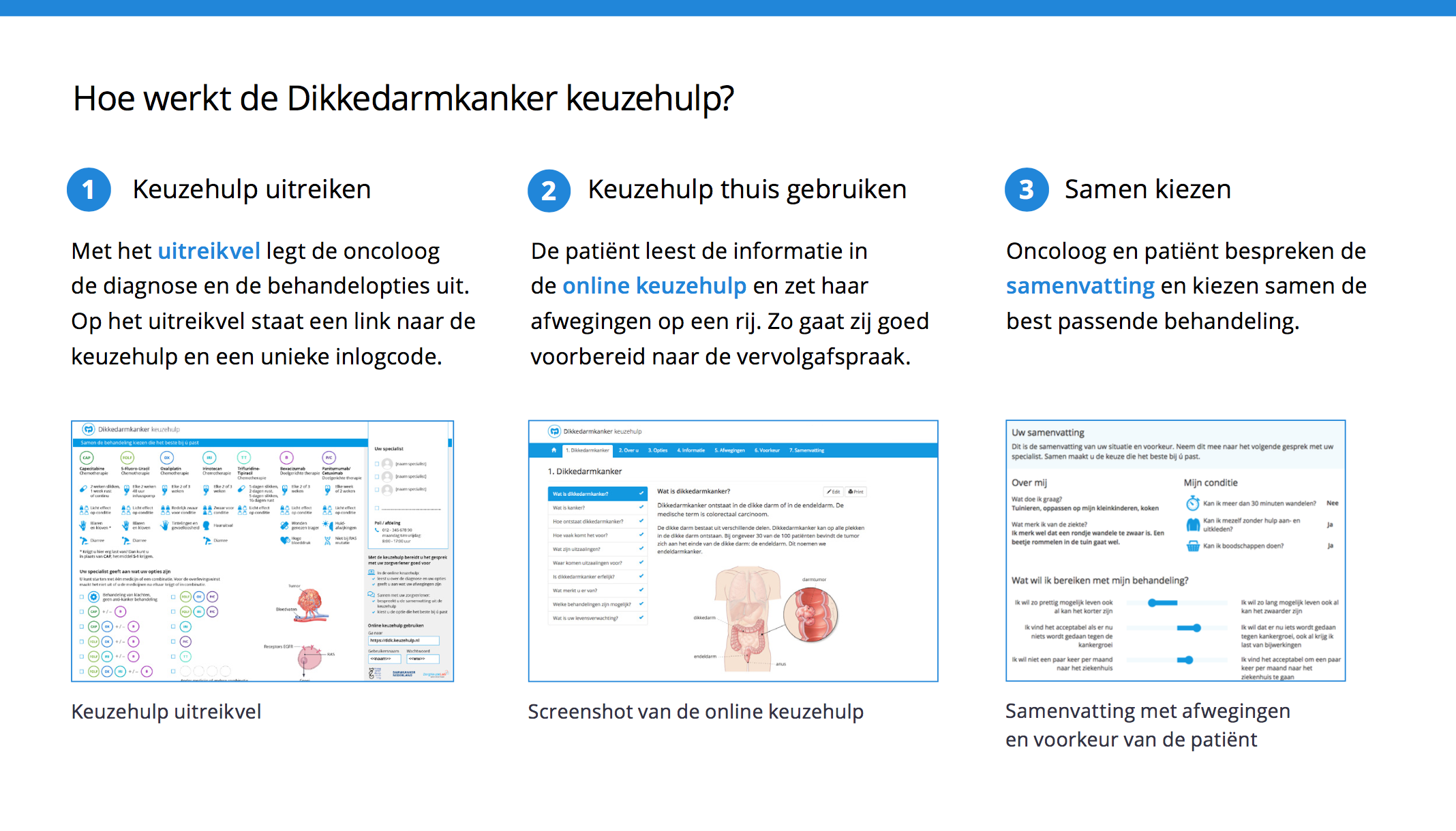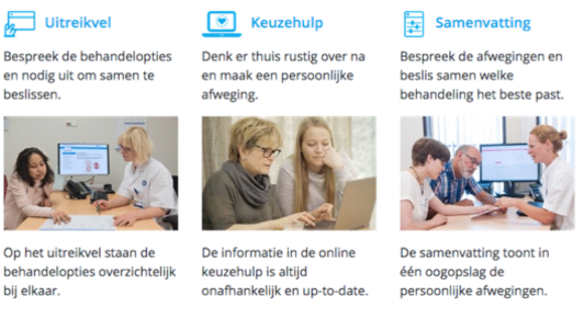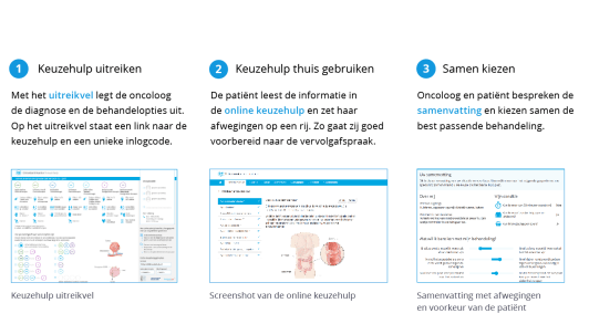 Online keuzehulp: patiënt kan thuis, eventueel met een naaste, gepersonaliseerde informatie over de diagnose en behandelopties nalezen. Vervolgens zet ze haar afwegingen en voorkeuren op een rij.