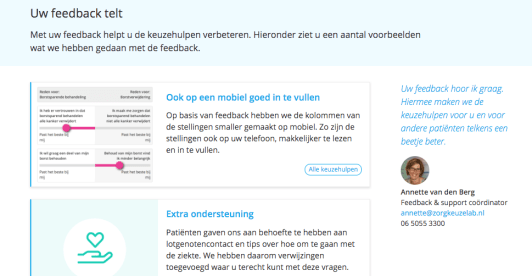 Omdat patiënten aangaven behoefte te hebben aan lotgenotencontact en tips over hoe om te gaan met de ziekte, hebben we in de keuzehulpen concrete tips en links opgenomen waar ze hiervoor terecht kunnen.
