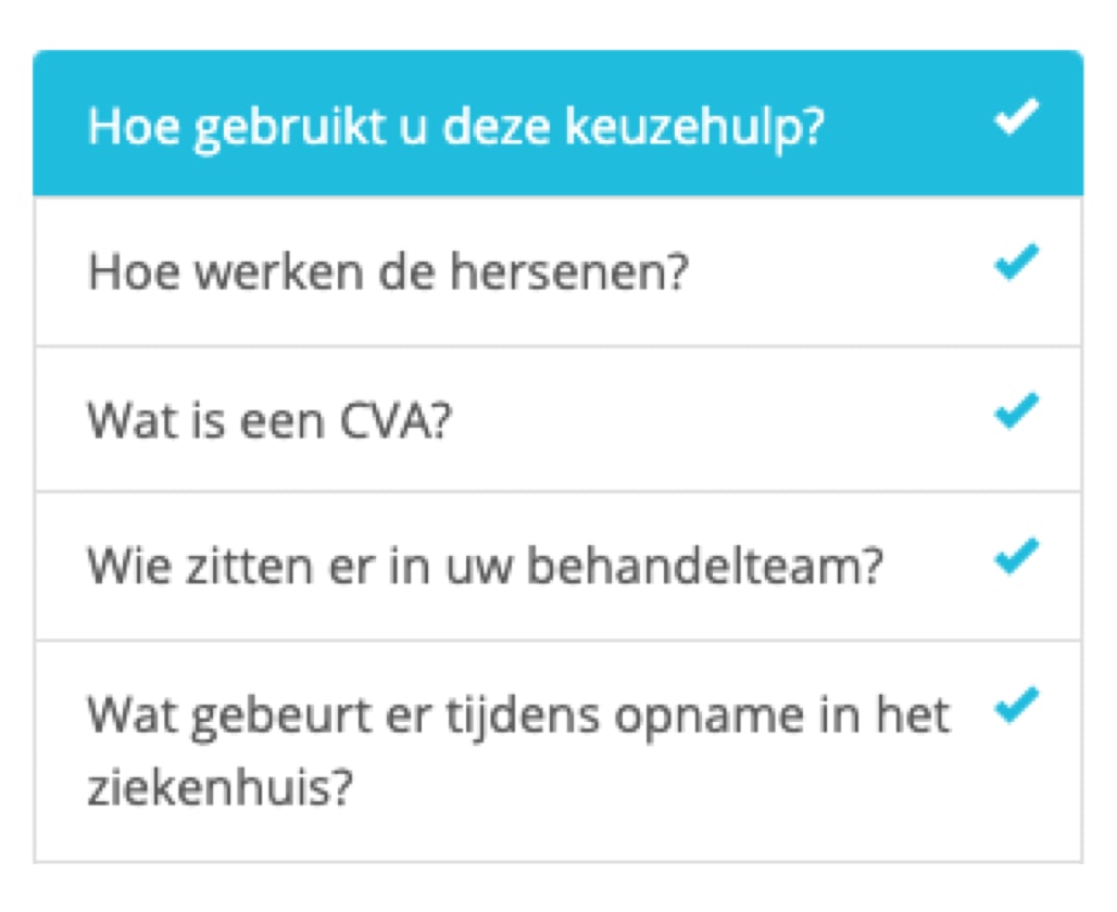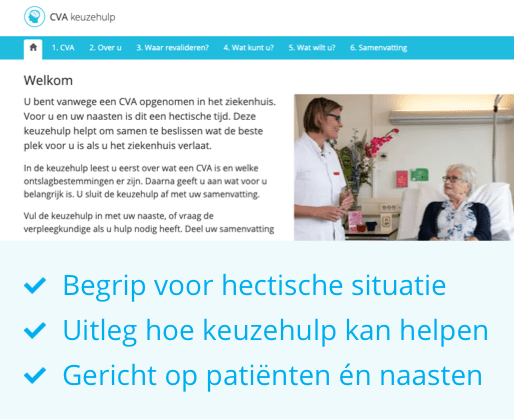 CVA patiënten en naasten gaven aan dat er veel op ze afkomt tijdens opname in het ziekenhuis. De introductie in de keuzehulp is aangepast om ze hier zo goed mogelijk doorheen te helpen.