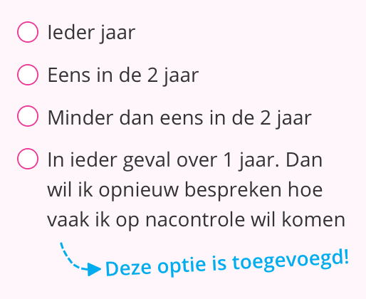 In de Borstkanker nacontrole keuzehulp geeft u aan hoe u uw nacontrole wilt invullen. Naar aanleiding van feedback is bij de vraag: ‘Hoe vaak nacontrole?’ een antwoordoptie toegevoegd.