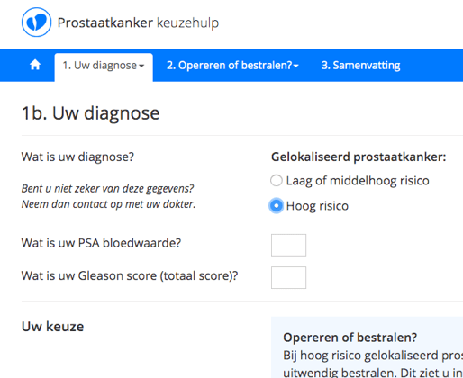 De keuzehulp is nu ook voor patiënten met hoog risico gelokaliseerd prostaatkanker met de keuze opereren of uitwendig bestralen. De medische content en uitreikvel zijn ook hierop aangepast.