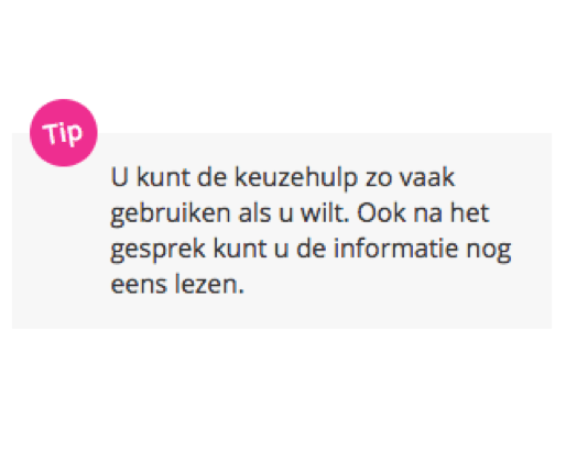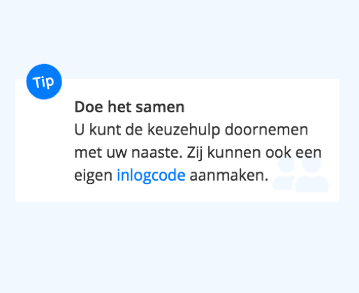 Veel patiënten lieten ons weten dat het prettig was om de keuzehulp thuis rustig door te nemen. En om dit samen met een naaste te doen. Dit hebben we als tips toegevoegd op de inlogpagina.