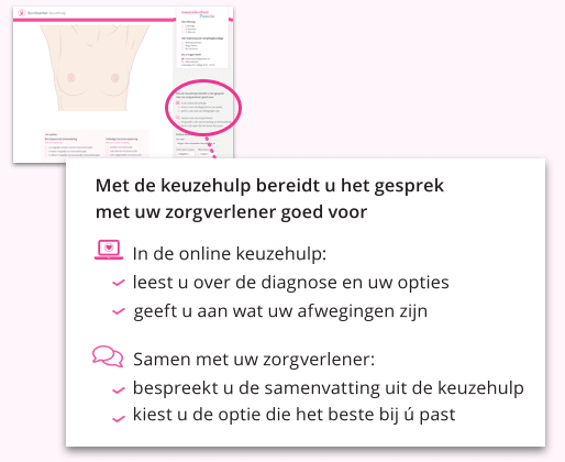 Naar aanleiding van feedback hebben we in de Borstreconstructie keuzehulp de uitleg over reconstructie met rugspier en prothese uitgebreid, inclusief bijpassend ervaringsverhaal.